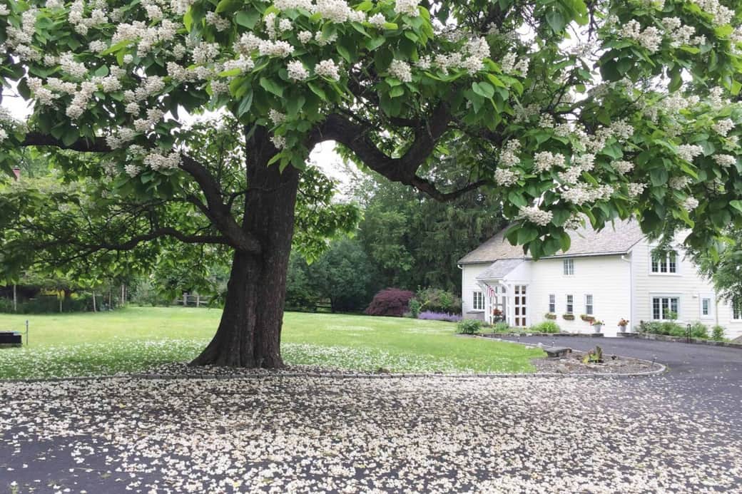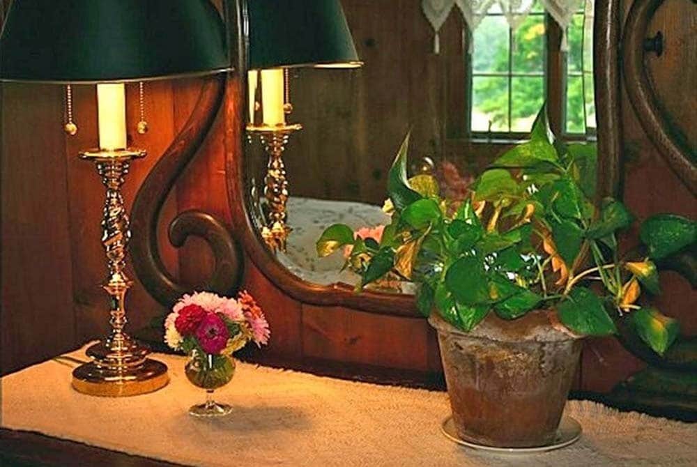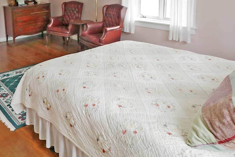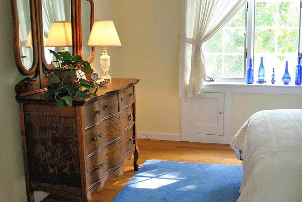 The Peach Room is a bright room on the southwest side of the house, on the main level, has two twin beds, private bathroom, and views of the mountains and fields.
